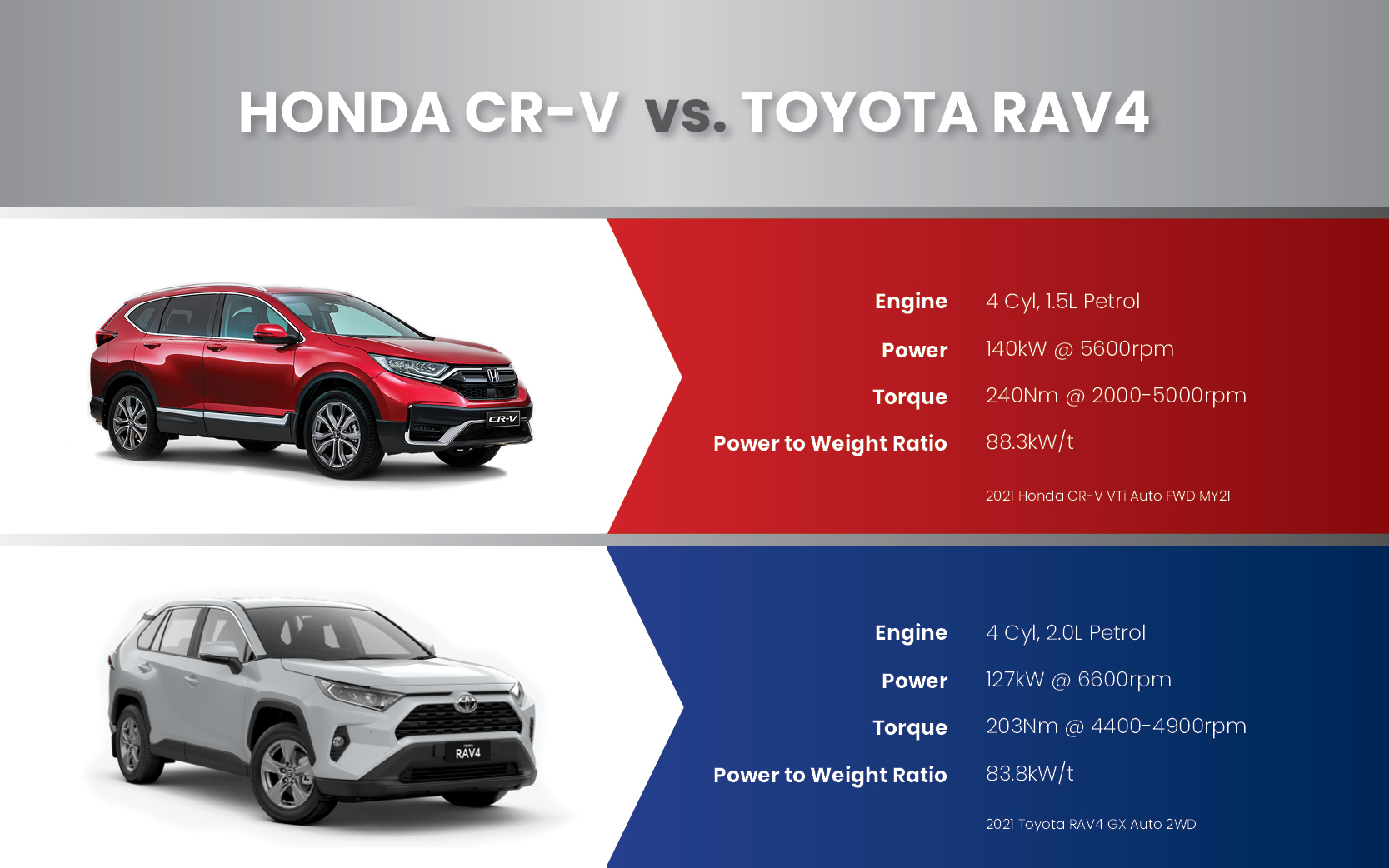 Both models are pretty well matched when it comes to performance. The 1.5l VTEC turbo is the standard engine in six out of the seven CR-V variants. It delivers around 140kw and 240Nm of torque. The RAV4 has a 2.0l petrol engine, delivering 156kw and 198Nm of torque.